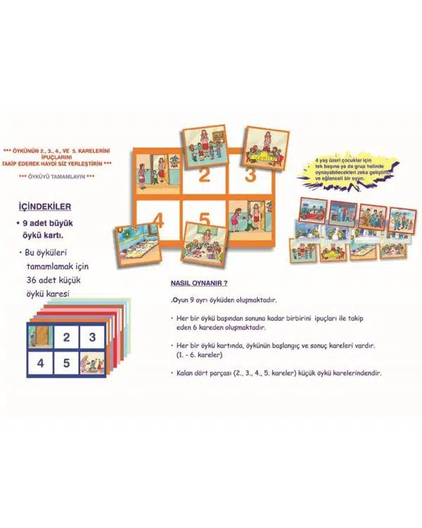 4 yaş ve üzeri çocuklar için uygundur. Oyun 9 Ayrı Öyküden Oluşmaktadır. Her Bir Öykü Başından Sonuna Kadar Birbirini İpuçları ile Takip Eden 6 Kareden Oluşmaktadır. Her Bir Öykü Kartında Öykünün Başlangıç ve Sonuç Kareleri Vardır. (1. Ve 6. Kareler) Kalan 4 Parçası (2., 3., 4., Ve 5. Kareler) Küçük Öykü Karelerindendir. Öykünün 2., 3., 4. Ve 5. Karelerini İpuçlarını Takip Ederek Haydi Siz Yerleştirin. Öyküyü Tamamlayın 4 yaş üzeri çocuklar için tek başlarına ya da grup halinde oynayabilecekleri zekâ geliştirici ve eğlenceli bir oyun.