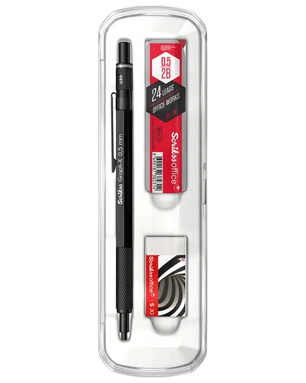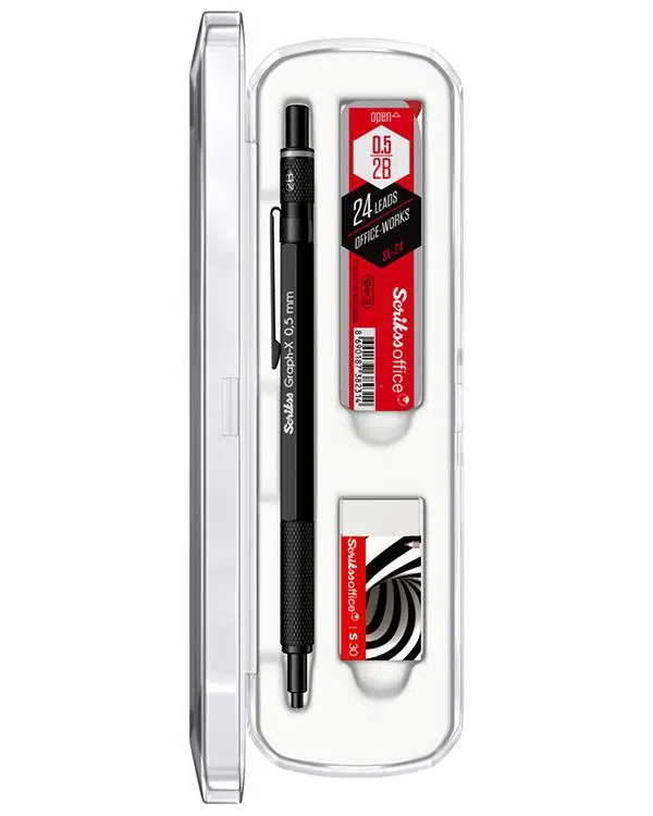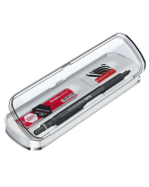 Graph-X 3’lü set içerisinde 0.5 mm uçlu graph-x mat siyah versatil kalem, silgi ve 0.5 mm 2B uç bulunmaktadır.