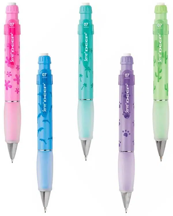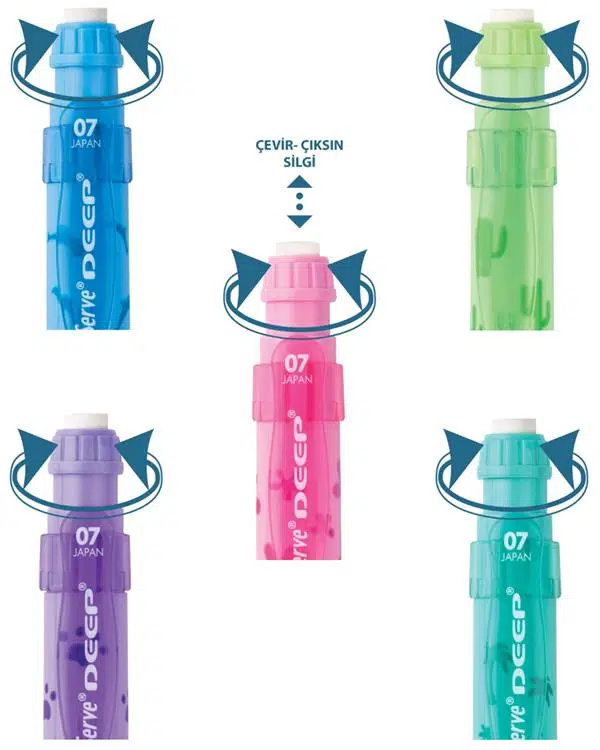 Set içerisinde; Pembe Çiçek, Mor Pati, Yeşil Palmiye, Mavi Yunus ve Yeşil Kaktüs olmak üzere toplamda 5 çeşit Serve Deep Versatil 0.7 Uçlu Kalem bulunmaktadır.