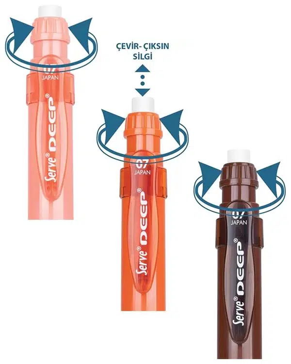 Set içerisinde; Kiremit, Toprak Kahverengi ve Mercan olmak üzere toplamda 3 renk Serve Deep Versatil 0.7 Uçlu Kalem bulunmaktadır.