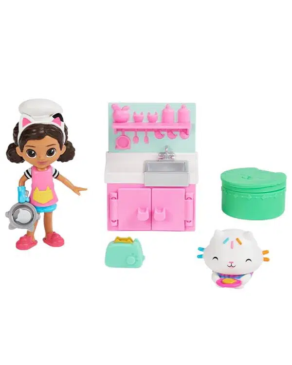 Başına bastırınca hareket eden Gabby, mutfağında marifetlerini gösteriyor. Pembe kedi desenli önlüğü ile mutfak şefi gibi görünen Gabby kedisine yemek hazırlıyor ve onun karnını da doyuruyor. İçerisinde sürpriz kutusu olan Gabby’ bakalım neler ile karşılaşacak?
