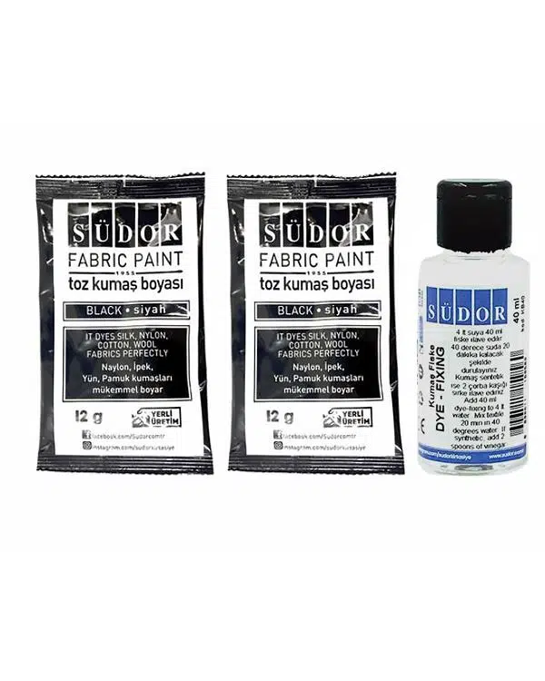 Set İçerisinde; 1 adet Südor Toz Kumaş Boyası Fiskesi 40ml ve 2 adet Südor Toz Kumaş Boyası Siyah 12gr bulunmaktadır.