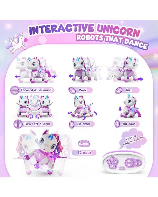 2.4 GHz uzaktan kumanda sistemi sayesinde oyuncak, ileri–geri hareket edebilir, sağa–sola dönebilir ve kolayca kontrol edilebilir. Dans modu sayesinde eğlenceli hareketler sergiler ve ışıklı–sesli tepkileri ile çocuklara keyifli bir oyun ortamı oluşturur. Oturma, yavaş ilerleme, aşağı inme ve hızlı ilerleme gibi farklı hareket komutlarını yerine getirerek interaktif bir oyun deneyimi sağlar.