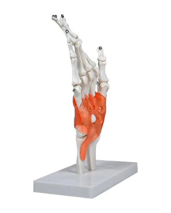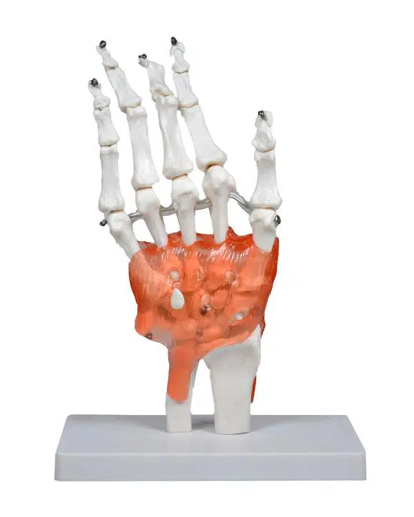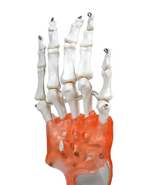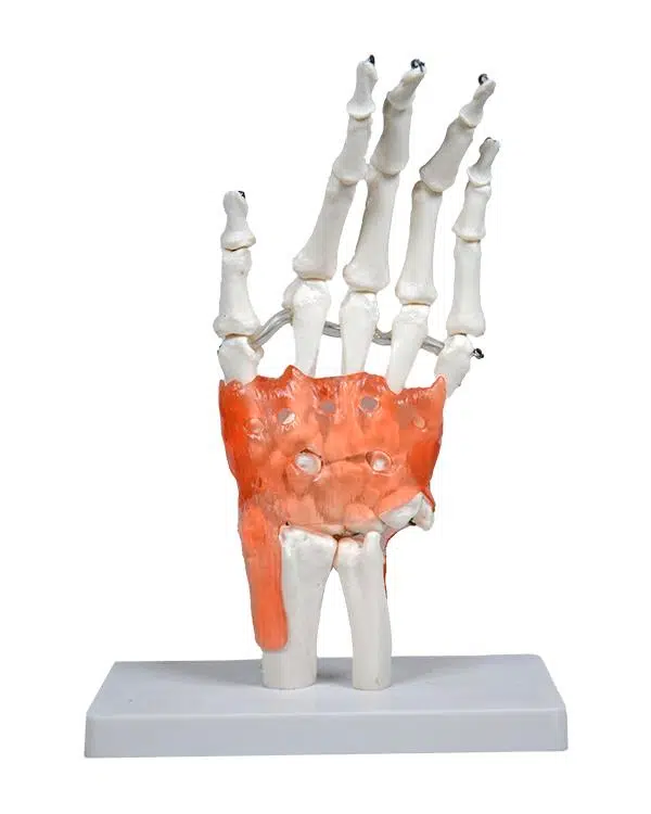 Model, ön başlangıcından beş parmakla biten kısma karşılık gelen eklemleri ve bağlarla, el ekleminin anatomisini ve mekaniğini net ve doğru bir şekilde gösterir.