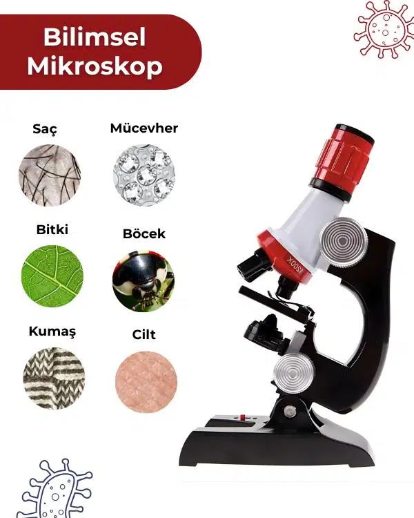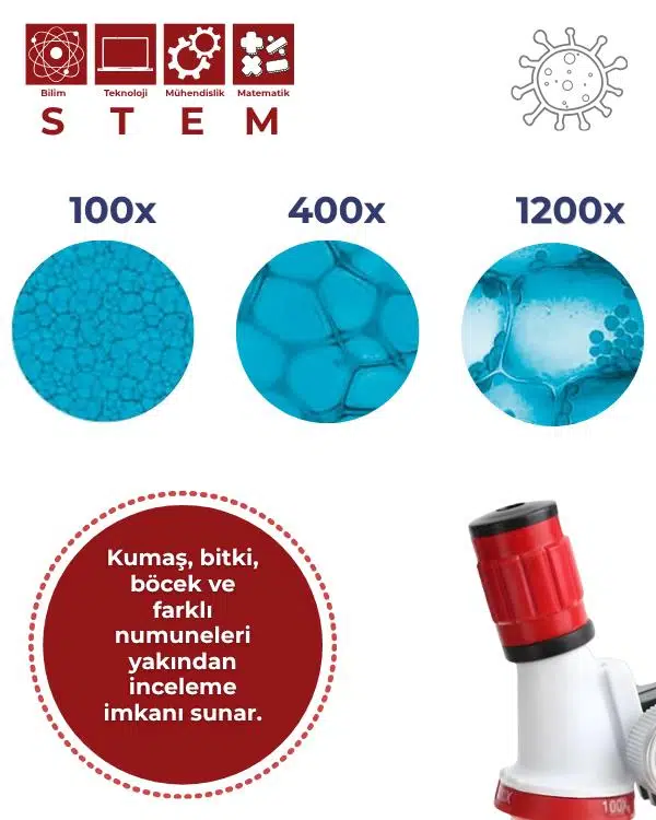 Temel ışıklı bilimsel çocuk mikroskobu; çocukların ve başlangıç seviyesindeki öğrencilerin bitki, böcek, kumaş, saç, cilt ve farklı numuneleri yakından inceleyebilmesi için tasarlanmış eğitici bir gözlem setidir. 100x, 400x ve 1200x büyütme seçenekleri sayesinde farklı örnekleri daha ayrıntılı şekilde görüntülemeye yardımcı olur. Işıklı yapısı ve odak ayar mekanizması sayesinde kullanım kolaylığı sunar.