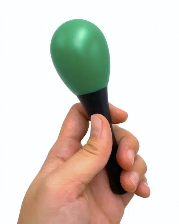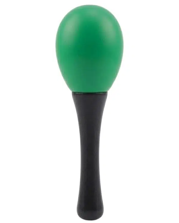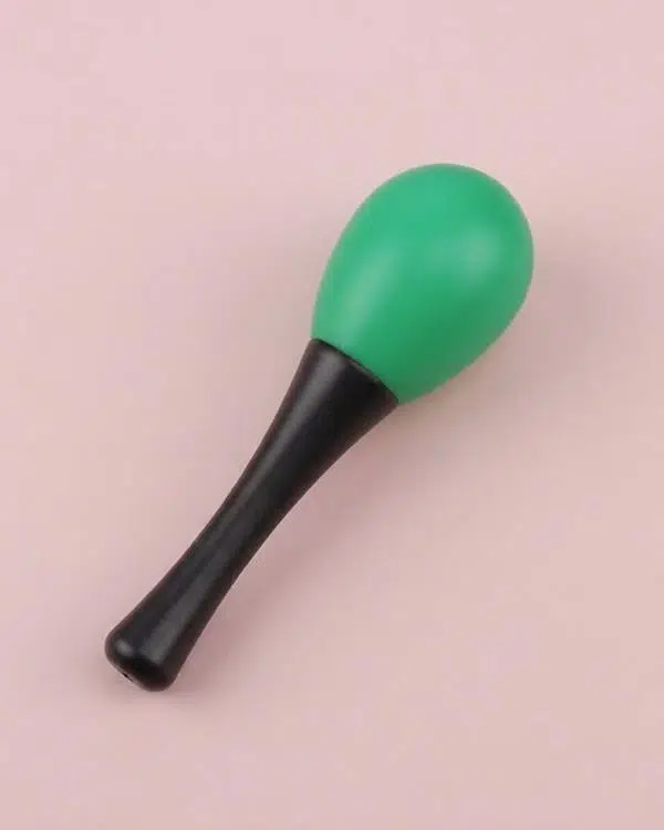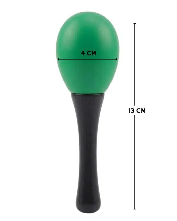 13 cm uzunluğa ve yaklaşık 4 cm baş çapına sahip ergonomik yapısı sayesinde elde rahat tutulur ve dengeli bir kullanım sunar. Ürünün üst kısmı yeşil marakas formunda olup, sap kısmı siyah renktedir. Bu kontrast tasarım hem dikkat çekici hem de kullanışlı bir görünüm sağlar.
