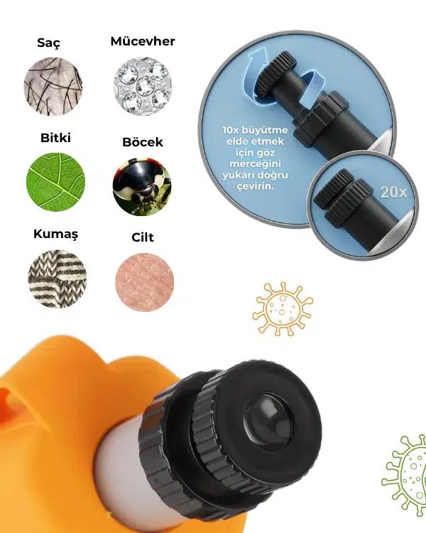 Temel STEM mikroskop seti, mikro dünyanın kapılarını çocuklara ve gençlere açan pratik bir eğitim aracıdır. Plastik gövdeli mikroskop, hafif ve dayanıklı tasarımıyla kolayca taşınabilir ve kullanımı rahattır. 100x, 400x ve 1200x büyütme seviyeleri sayesinde hücreler, bitki ve hayvan örnekleri detaylı şekilde incelenebilir. Döner 10x ve 20x oküler mercekler ile büyütme oranları hızlıca ayarlanabilir.