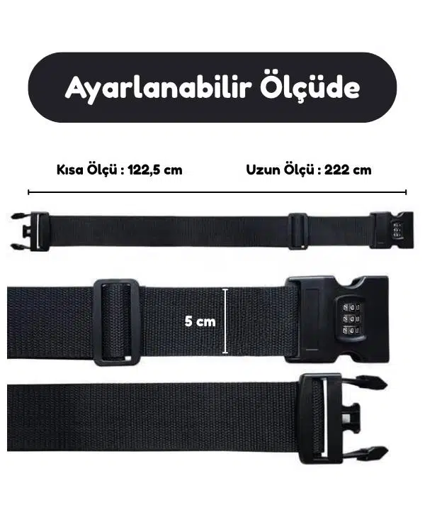Ayarlanabilir yapıya sahip olan ürün, yaklaşık 122,5 cm ile 222 cm arasındaki farklı ölçülere uyum sağlayarak küçük, orta ve büyük boy valizlerde rahat kullanım imkânı verir. 5 cm genişliğindeki kayış yapısı valizi daha dengeli kavramaya yardımcı olurken, tekli kullanımda boydan sabitleme, ikili kullanımda ise çapraz şekilde ekstra güvenlik sağlamak için tercih edilebilir. Hem seyahat güvenliğini destekleyen hem de valizinize düzenli ve şık bir görünüm kazandıran kullanışlı bir bagaj aksesuarıdır.
