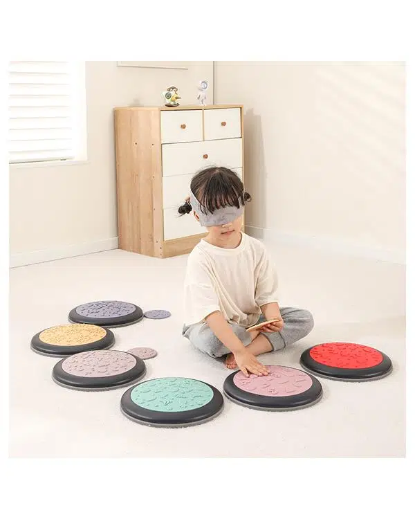 2 yaş ve üzeri çocukların kullanımı için uygundur. Bu oyunla çocukların dokunma duyusu ve gözünde canlandırma yetileri geliştirilmek istenmektedir. Çocuklar hem ayaklarını hem de ellerini kullanarak dokunma duyularını çalıştırabilecek. Çocuğun gözleri set içerisinde yer alan göz bandı ile kapatılır 6 büyük 6 küçük farklı materyal yere düzülerek çocuklardan ayaklarıyla veya elleriyle diskleri eşleştirmesi istenir. Bu materyaller ile çocuklarınız ifadelerini sözel olarak da açıklayarak becerilerini geliştirebilir. Aynı zamanda el, ayak ve beyin koordinasyonu sağlanan bu materyaller ile farklı oyun ve aktiviteler de geliştirilebilir. Bu duyu bütünleme materyaline bayılacaksınız.