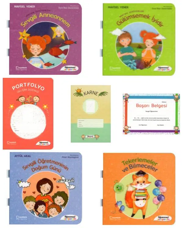 Her biri 40 sayfadan oluşan 8 adet fasikül, 7 adet eğitim kitabı, 4 adet kültür kitabı, portfolyo, karne, gelişim gözlem dosyası ve başarı belgesi set içerisinde yer alan parçalardır.