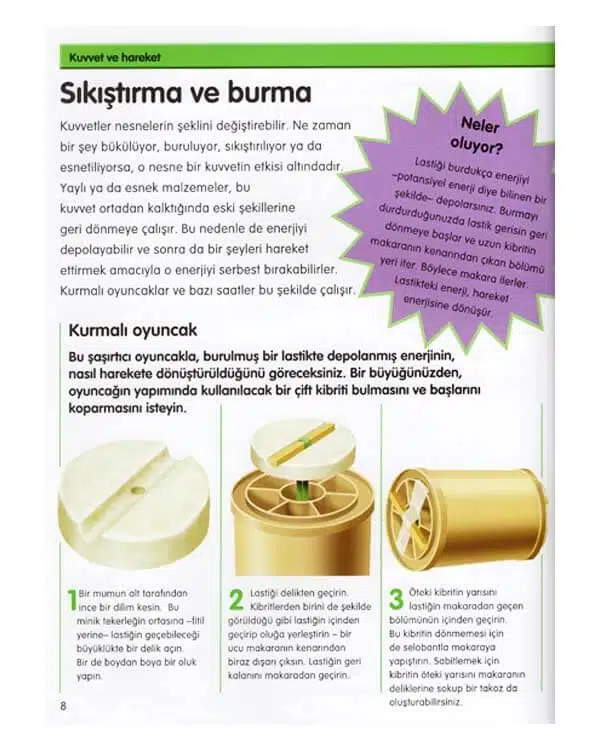 Bu kitapta bazıları klasikleşmiş, bazıları da yepyeni olan deneyler adım adım anlatılıyor. Etkinliklerin yönergeleri oldukça açık, illüstrasyonları da göz alıcı. Kitapta küçük bir sözlüğün yanı sıra yararlı internet sitelerinin adresleri de yer almaktadır.