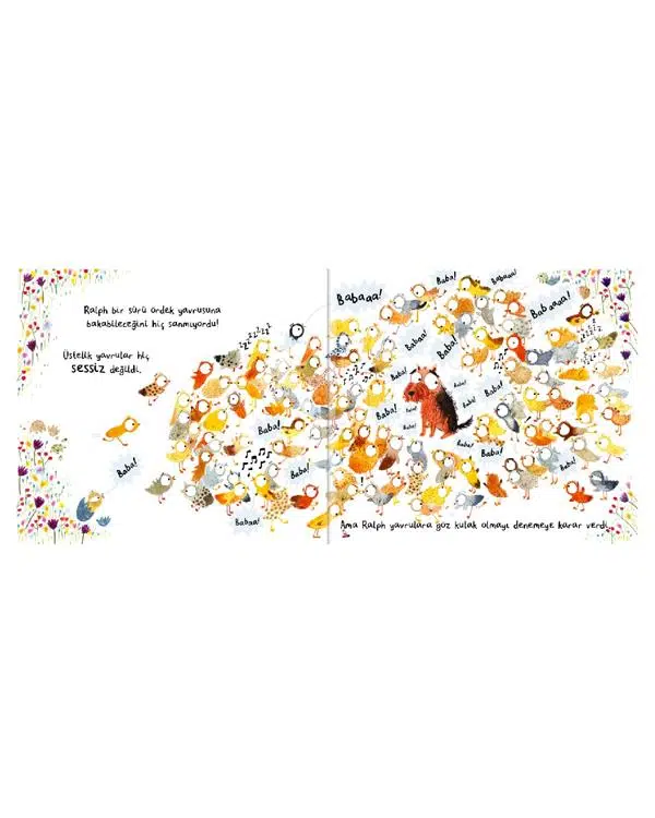 Keyifli bir günde güzel bir yürüyüş yapan köpek Ralph, çıtırdayan yumurtadan bir ördeğin çıktığını görür. Yavru ördeğin ilk kelimesi “Baba” olur. Arkasından pek çok yavru ördek katılır onlara ve Ralph ne yapacağını bilmez bir şekilde yavru ördeklere babalık yapmaya çalışır. Lorna Scobie bu hikayesi ile aile olmanın değerini vurgulamaktadır. Eğlenceli bir hikâye sizleri bekliyor. Rengarenk, kuşe kağıdı sayfalar ve kalın kuşe kağıdından kapağı ile kaliteli ve dayanıklı bir kullanım olanağı sunar. Çocukların, aile ve ilişkiler gibi konularda gelişmesini sağlar.
