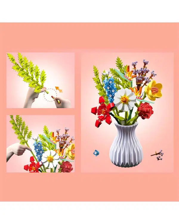 Her bir çiçek modeli, doğadaki gerçek çiçeklerden ilham alınarak tasarlanmıştır. Renkli yapraklar, dallar ve vazo bir araya geldiğinde hem eğlenceli bir oyun hem de dekoratif bir görünüm oluşturur. Parçalar kolayca takılıp çıkarılabildiği için çocuklar da bu sekiz çiçeği farklı şekillerde düzenleyerek her seferinde yeni bir buket görünümü oluşturabilir.